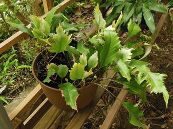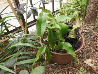 2013.06.10:ヘゴ鉢で育てていたものを、これもヘゴ鉢のまま(固定するために使用した針金は外している)深鉢に活けただけ。こちらも用土は軽石と鹿沼。これでしばらく様子を見てご機嫌を観察することにしよう。
