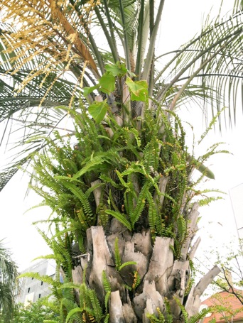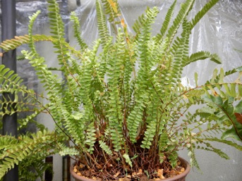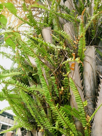 タマシダは観葉植物としてツデーという名前で出回っているので、アジアンタムという名前で流通しているハコネシダやホングウシダの仲間と同じ身近な存在のシダの一つ。ヒトツバのところで1990年頃八丈島に行ったとき、ヤシに着いたヒトツバを剥がしたのをもらってきたことを書いたが、下の写真は幕張で撮影したもの。