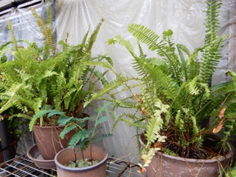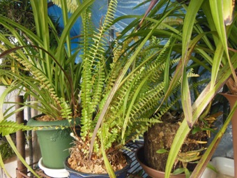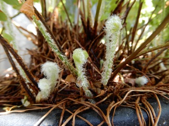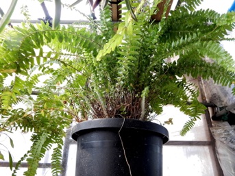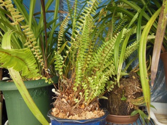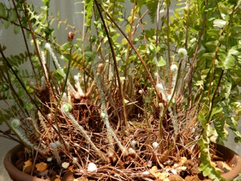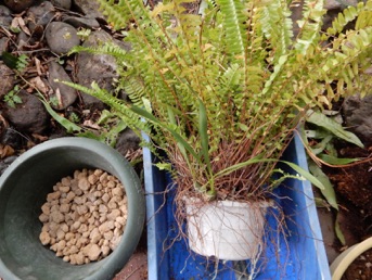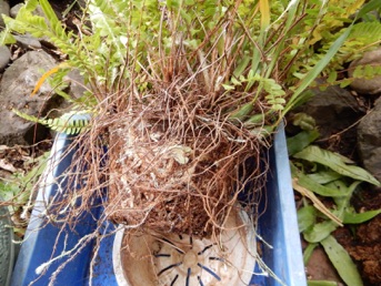 根鉢の脇にはみ出している根や脇芽を全て綺麗に刈り込んで2回り大きな鉢に赤玉+鹿沼混合土で植え替えた。玉状の茎はマキシラリア。元々はマキシラリアの鉢だったものがタマシダに占領された状態。でもマキシラリアを生かしていれば、春先にマキシラリアの黄色い花も楽しめる。タマシダもこれを含めて4鉢もあり、それぞれ株分けをしないと窮屈そう。これも譲り先を探すのが大変そう。どなたかまとめて引き取ってくれれば良いのだが。