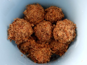 袋から出した乾燥水苔を水に浸して2日間水を吸わせた後、軽く水気と一緒にゴミ、アクを除いてソフトボール様の玉にする。