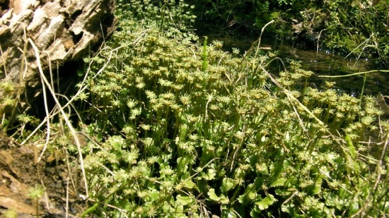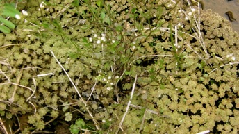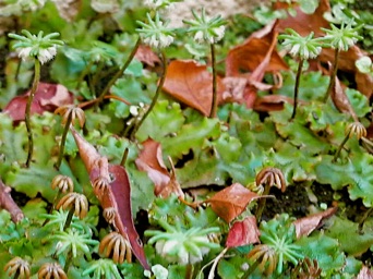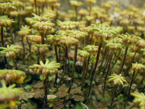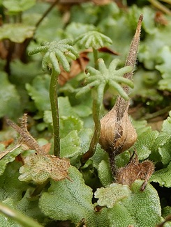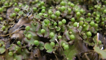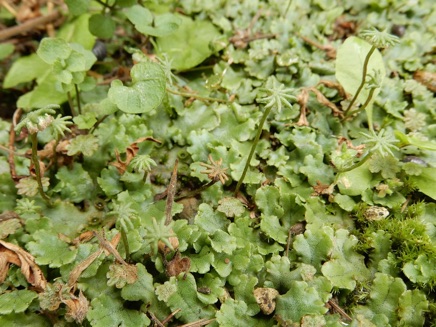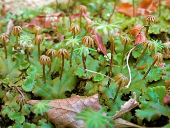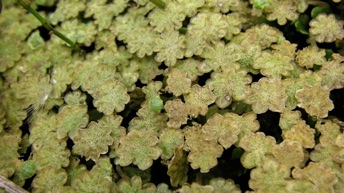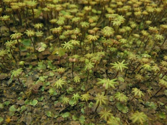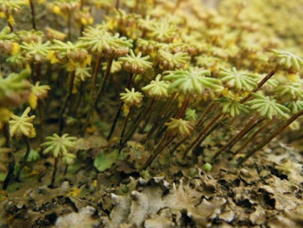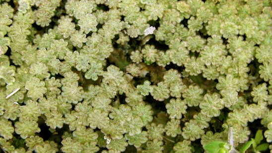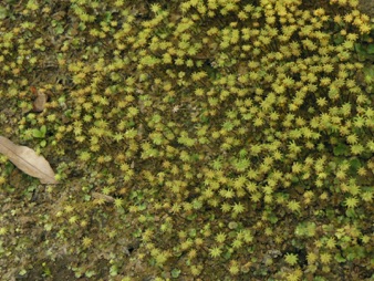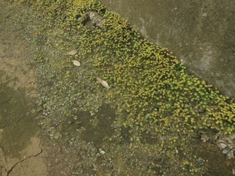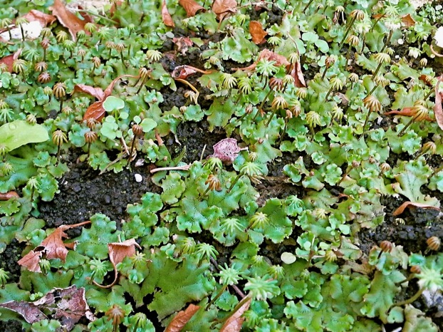 その灰皿の置かれたスペースの反対側にコンクリートで作られたプランターが置かれており、このゼニゴケはそこに繁茂していたのを見つけ撮影した。