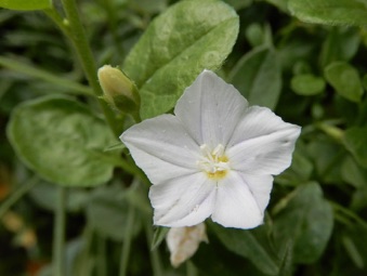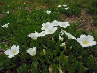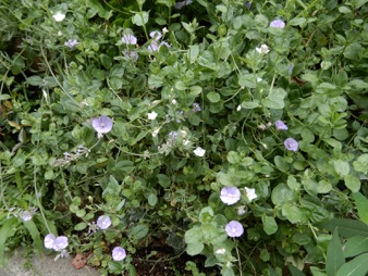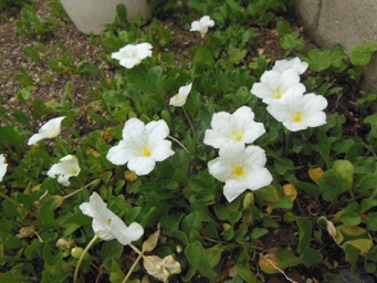 ペチュニアのカラフルな鉢植えはどこにでも売っているし見られるので撮影する気にならないが、この白い、野生化した姿にはつい足を止めてしまう。
