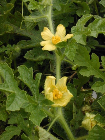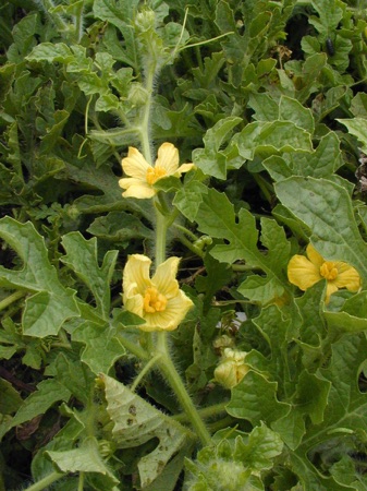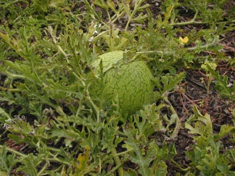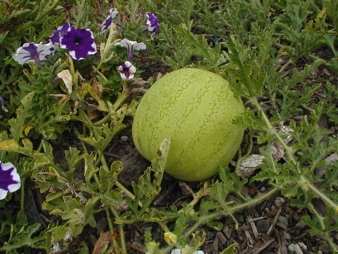 2000.09.28 カリフォルニア大学キャンパス内の生協売店前の狭い花壇で、他の草花と一緒に育てられて?いた。スイカが珍しいというよりも、大学キャンパス内でたくさんの人の手の届くところで実を膨らませている状況が面白かった。