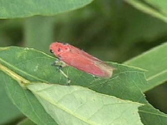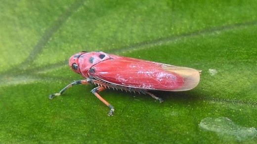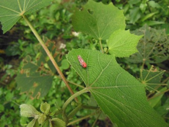 2004.08.25 タイ 赤カレン族の村 村のヨコバイの仲間。後にラオスのナンヤン村でも撮影したがどちらも赤いタイプ。日本のツマグロヨコバイと並べてみると色は大きく異なっていても形態的にはほぼ同じなので、先の??付きの種と比べると安心して見ていられる。