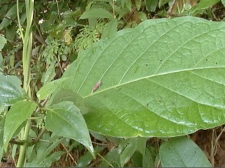 ヨコバイが留っているハート型の葉は「野菜カラスウリ」の葉。