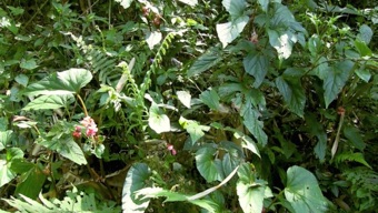 2004.08.24 タイ 赤カレン族の村 花はヤブミョウガにそっくり。しかし葉や茎の姿・形が全くちがう。葉や茎の姿からするとベゴニアに似ている。ヤブミョウガならばショウガ科cとでも付けて、a,b,cの3点セットでも良かったのだが、ショウガ科とするには自信がなさ過ぎ。