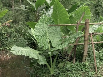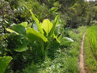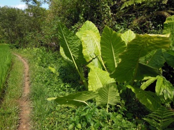 2013年8月 HHL 村の水田地域を潤す川岸で大きな葉を輝かせているのを撮影した。この川の流域にはここの他に数カ所クワズイモが大きな葉を広げているのが見られた。