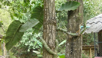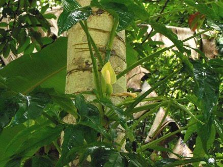 村の小学校の校庭の一隅に植えられていて見る度に大きくなっているようだ。この小学校の校庭の木の幹にはモンテステラも着生しており(2010.08参照)さらに、小学校脇の道を西に向かって1km程も行くとセロームの着生も見られる。いづれもサトイモ科の植物で、日本では観葉植物として地歩を築いているが、HHLでは何のために植栽しているのだろうか。