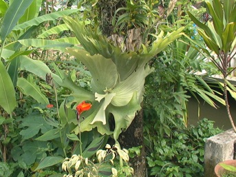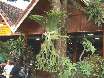 2006.08.04 ラオス ルアンパバン すぐ左下の写真と最下段2枚の写真はルアンパバンのレストランの入り口に着生していたビカクシダである。ホテルのビカクシダと同種である。この2つを見ればわかると思うが、ホテルのビカクシダは木の下の方に着生したために下に延びる栄養葉がほとんど見えない。それに比べてレストラン前のビカクシダは思い切り栄養葉を延ばし誇らしそうだ。手前にいる親子の大きさとの対比を見ればその大きさが想像付くだろう。我が家のビカクシダはこれとは異なる種であるが、無理とはわかっているが、このぐらいにまで大きく育ててあげたい。