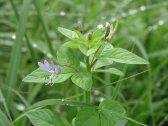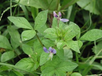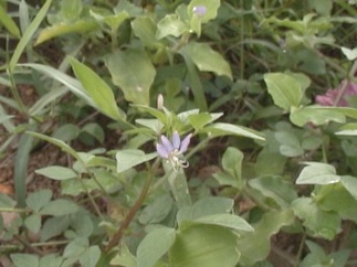 2006.08.09 ラオス ビエンチャン この花は過去3度のタイ&ラオス取材の度に観察し撮影している。ツユクサ?としているが葉の形を見る限りツユクサの仲間でないことは明白である。始め整理のため分類したときは花びらが4枚、つぼみの形が似ていることからクレオメ(フウチョウソウ)の仲間としたが、クレオメは1本の花茎の頂部に風車のように房状に咲くがこれは花は単体である。次にサワグキョウの花をひっくり返した形でもあることからそれも疑ったが違いそうである。そこでここでは便宜的にツユクサに?を付けて正確な名前がわかるまでここに置くことにした。名前がわかり次第修正しよう。