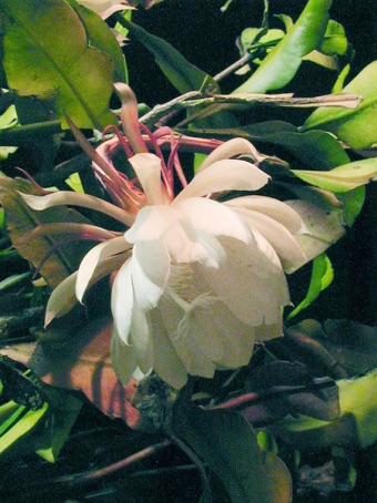 クジャクサボテンなのか月下美人なのか正確な品種名はわからないが、我が家にもその2種があり、月下美人は白花であるが名前の通り夜しか咲かない。クジャクサボテンは昼間咲くが我が家には赤い花しかない。最近はクジャクサボテンの花色は色々作られたようだから白いものがあっても不思議ではない。