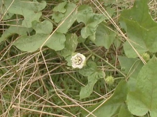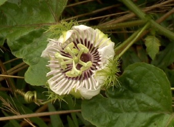 2006.08.06 ラオス ルアンパバン郊外 ナンヤン村の小学校の裏庭に咲いていたものを撮影した。見るからにトケイソウだが、パッションフルーツはトケイソウの仲間の果実であると何かで見た記憶もあり、ナンヤン村の小学校で園芸植物として植えたものか、食用にと植えたものか、それとももともと野性のものなのかわからない。
