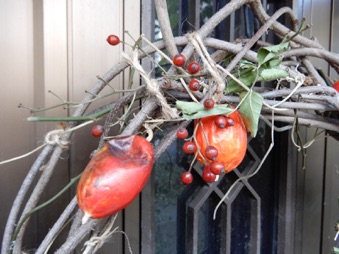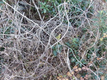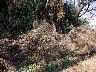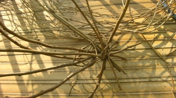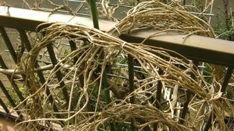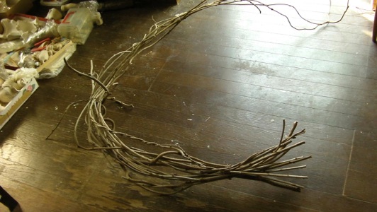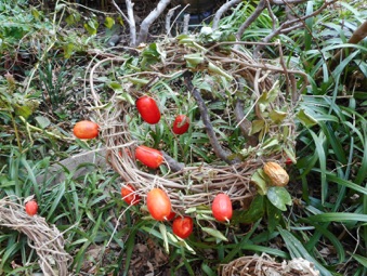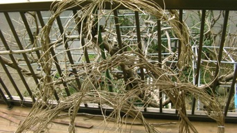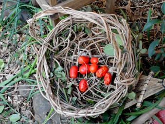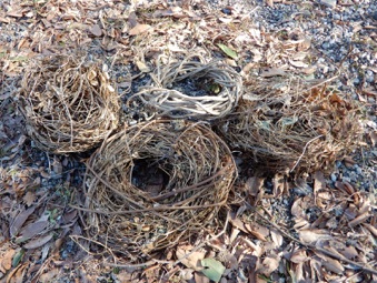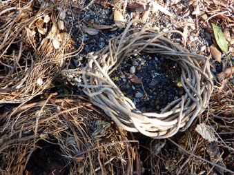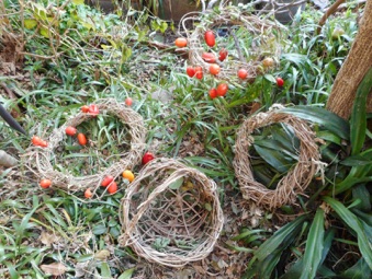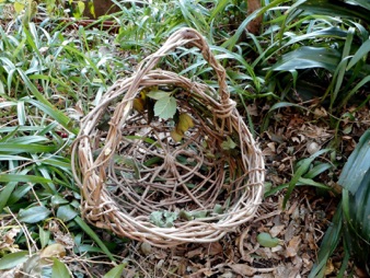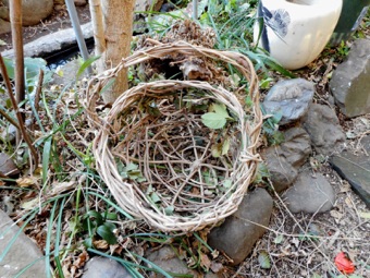 2012年3月14日記:毎年12月にビニールフレームを作る前に藤の剪定を行って、その蔓を保存しておき、時間がある時に細工物に利用している。一番簡単で良く利用するのはクリスマスリースであるが、あまり芸がないのでここでは籐籠を紹介する。