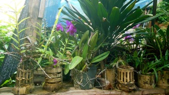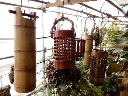 それぞれこれまで着生させていたヘゴを鉢の内側に収まるよう2、3分割して突っ込んでいる。カトレアは過保護とは思うが、隙間に水苔を詰めている。直上右の竹鉢は3箇所の縦割れが広がらないように、それぞれ銅の針金を使って編み上げている。