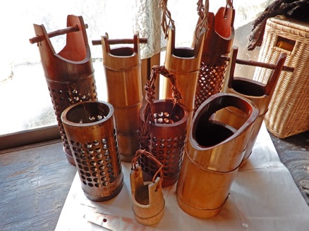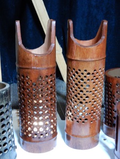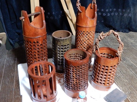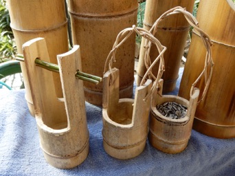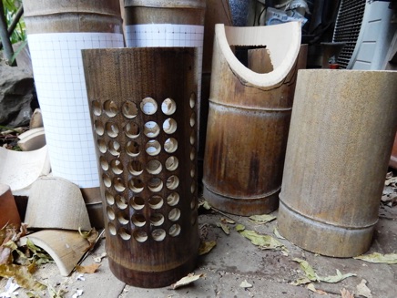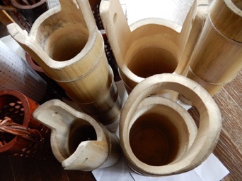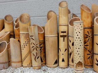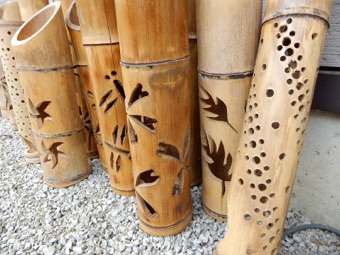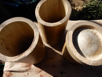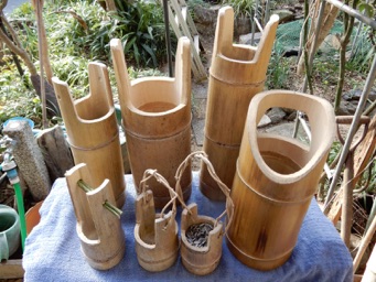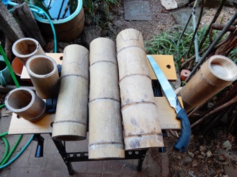 同じ1本の太竹からカットした未着手分がまだ4個残っているのと、これより少し細い竹がカットせず丸ごと残っている。細工の手始めとしてはこんなところか。背の高い2つのランタンと一緒に、興に任せて全てにニスを塗ってしまったが、ラン鉢として使用するものには無駄なことだったのかも知れない。