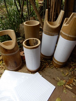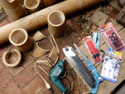 乾燥させていたが太い方の竹にヒビが入ってきたのでこの辺りで加工を始めることにした。まずはノコギリで切り出せる範囲の墨打ちとカット。節の部分に虫食いがないのがタイの竹との大きな違い。上段右の細いピストル型のものは金属ノコギリ。木材用ノコギリ(左となり)の導入部用。