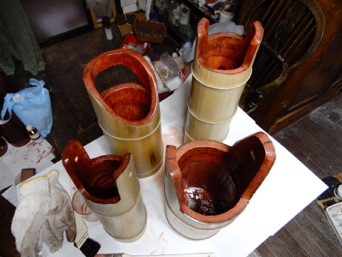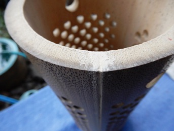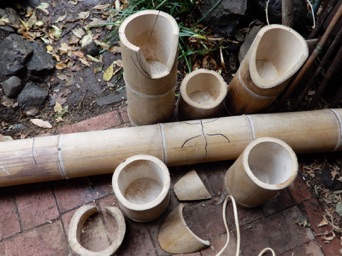 作業後の感想としては、竹は切り倒してからある程度は寝かせておいた方が良いようであるが、細工のために小割りした後は一気に作業をして、竹筒内外に塗料を塗り、竹繊維の水分量が大きく変化しないようにすることが必要と感じた。特に後半の作業では塗料やパテを乾かしている間にも、パシッと竹に亀裂の入る音が聞こえた。前日パテを塗ったところが更に割れが進んで、前日のパテを一旦全部掻き出し、新たなパテで埋め戻したこともあった。竹細工はこんな乾燥した時期に行うものではないのかも知れない。