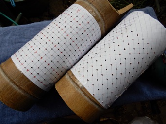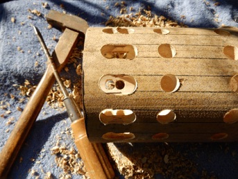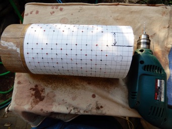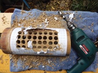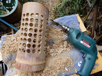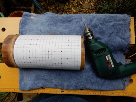 太い竹の残材。1cm方眼、ひび割れを外した2cm単位のマークを2mmのドリルで穿孔。その後、安全重視で9mmのドリルを使用。