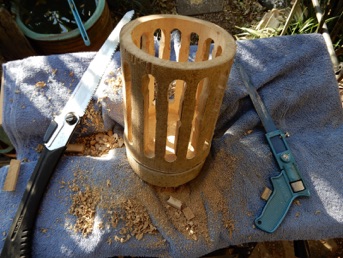 この後内外のバリ取りを兼ねて紙やすりで磨いてからニスを数回に分けて塗って仕上げる。中央下部は100均のランタンを入れる穴。
