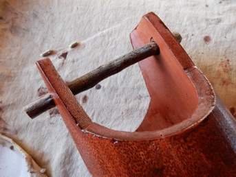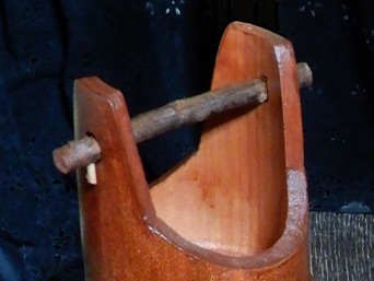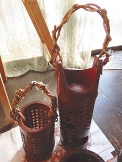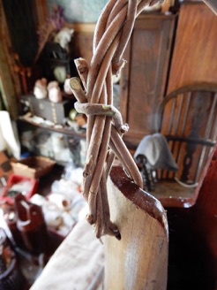 初めは細い竹で作り始めたが、途中で気が変わって上の細枝にし、ストッパー部には藤蔓をはめ込んだ。ボンドが乾いてからニス。