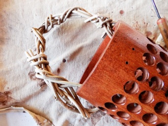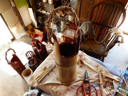 秋に剪定し乾かしておいた藤蔓を使って持ち手を2個作った。15mmの穴には蔓2本どり。水やりに耐えるようこれにもニスがけ。