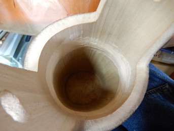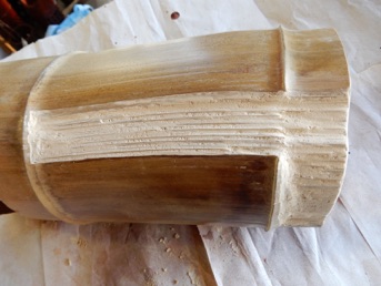 内側の節/隔壁を取り去ったところに木工用パテを塗り込んで目止めを施す。細い方の筒はかろうじて手指の届く範囲まで。