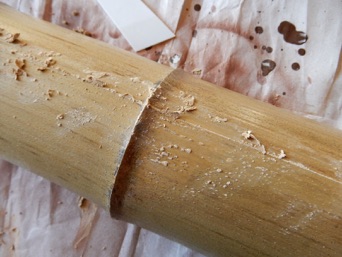 細い方の竹の加工開始。先端に近い方のより細い部分はヒヨドリの餌箱に。根元の方は節の内側を刳り貫いて花入れの予定。花入れは水を入れるので内側を油性の塗料を数回塗り重ねて耐水性を与える必要がありそう。