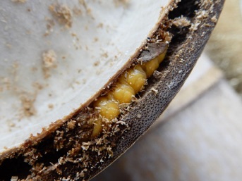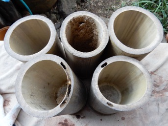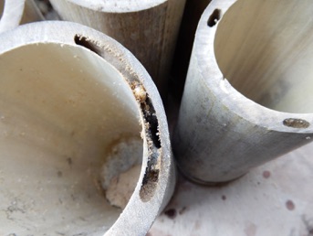 細い竹の残材をカットしたところ虫食い穴がたくさん出てきた。また食べかすがたくさん溜まっているパートもあった。