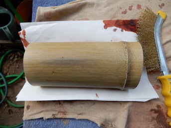 カットした細い竹の表面および内側をワイヤーブラシ2種を使って汚れを削り落とす。ワイヤーブラシの後、湿らせた布で拭う。