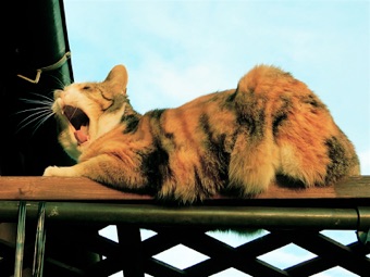 ビニール温室フレーム天井と2Fベランダ床との隙間にお猫さま用の休み処を作った。床に当たる部分は古い竹すだれ。梯子を登る他にネコ棚と藤棚の間に橋を架け2Fベランダからも藤棚を経由して行き来出来るようにした。3匹とも今のところ気に入っているようだ。
