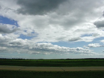 エドモントン空港近くのキャンピングカー会社で新車のキャンピングカーを借りて、途中市内でキャンピング用品や食料など買い込んで、いよいよドラムヘラー経由カナディアンロッキーを巡るキャンピングカーでの周遊が始まった日、ドラムヘラーに向い始めたばかりの車窓から撮影した雲。空気が澄んでいるのだろう、遥か遠くの雲まで見渡せた。