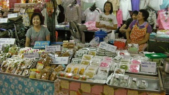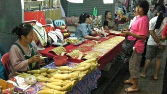 ここでは当たり前の店を並べている。ちょっと変わっているのは貴金属?の店の屋台と、仏具屋。日本の仏具屋は自宅の仏壇や墓に供する商品がほとんどだが、ラオスでもそうであったが、托鉢に歩く僧侶への供物がたくさん並べられている。それらはキンキラの原色の包装がなされていて、仏門の僧侶が喜ぶようには思えない。供える側の自己顕示というか自己満足を助長するものようにしか見えない。でも面白い。