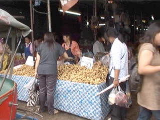 南国の香りのする果物が多いのは当然として、日本と同じミカン、リンゴ、柿も売られていた。柿については、村の森に入った時、6,7mほどの背の高い木の梢にオレンジ色の実を見つけ、ビデオカメラでズームUPしたところ柿の実であることが確認できた。当方の宿泊させていただいた家のご婦人に柿を振舞われたが、村で採れたものであったことにその時理解した。つまり、柿に限らずミカンもリンゴもこのチェンライ周辺地域で採れたものと推測できる。