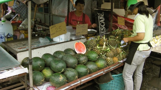 チェンライ市場の敷地の外側、いわゆる場外の売り場である。場外1では果物売りの店頭を紹介する。