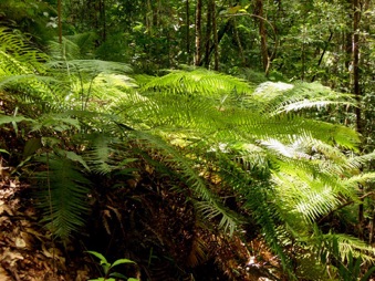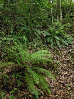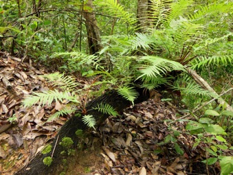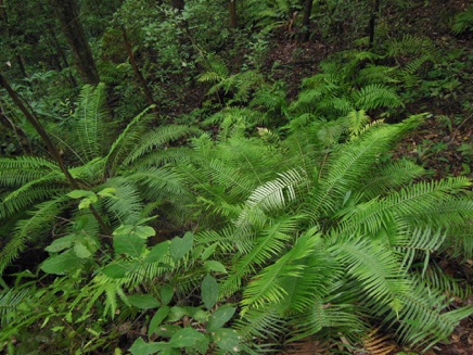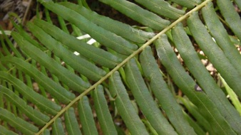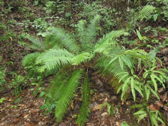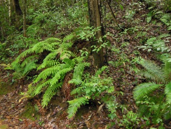 下段にUPするのは上のシダの真上に着生していたシダ。もしかすると、地面に生えていたものは着生シダが地面に落ちて成長したものかも知れない。また、話の方向が大きく曲がってしまうが、木に着生したシダを別のものとしてチェックしていると、当方がカザリシダとして整理しているものより、この写真の種の方が似ているようにも思えるのだ。こまったことだ。