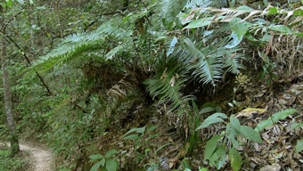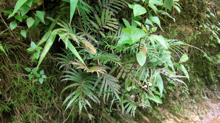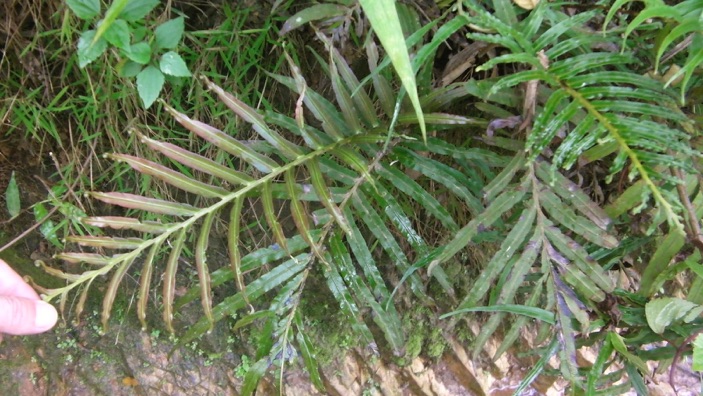このシダは村の集会所のすぐ脇の道の対面の斜面に生えていたので、村に来て一番最初にカメラに収めたもの。次のページにもこのシダのすぐ近くに生えていたものであり、非常に良く似ていたのだが、こちらの葉の縁には切れ込みがなく、次のページのシダの葉には細かい切れ込みがあるので異なるものと判断したが、名前に自信がないのでキジノオシダ1、2とした。下段の写真の左隅に写っているのは当方の指。そんなに大きなシダではないのがわかる。
