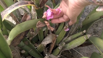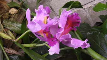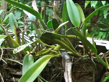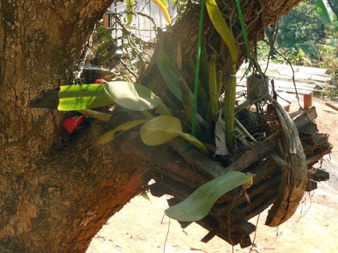 この家のカトレアは左の写真の左隅にチョッと顔をのぞかせているヤシの実。ヤシの実の小割りでカトレアの根茎を包んだような形にひもで結わえて、空中にぶら下げていた。ヤシの実が新しいもののようだったので、株の大きさに合わせて継ぎ足しているように見受けられた。