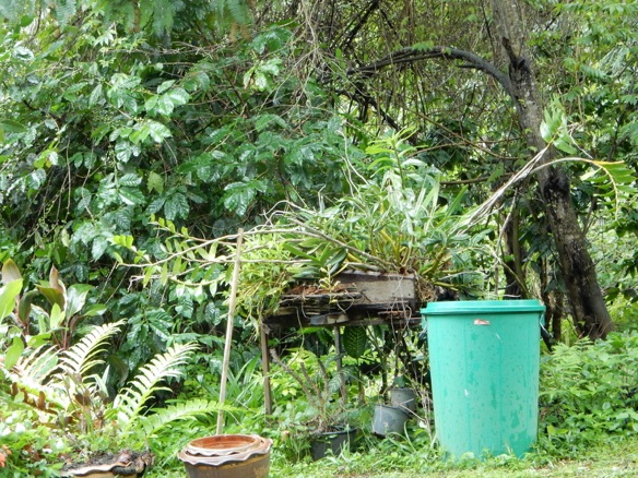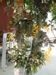 2013.02 HHL : 上のラン棚は当方がお世話になる家のご主人の栽培の様子。左の太い茎に1枚の葉の種はカトレア。東南アジアにあるものではないので、外部から入手したもの。中央、及び右の太い茎に数枚の葉がついたものがDen.クリソトキサム。最右端にある赤い花はベンケイソウの仲間。地上から1mほどの高さに棚を設けその上に植木鉢もバスケットも平置きしている。