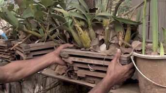 右の写真は上の作棚とは異なるが、ここではバスケットにヤシ殻で植え込んでいるのが見える。
