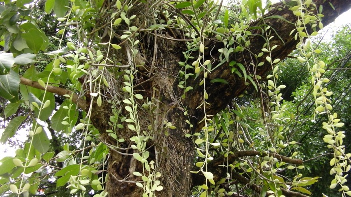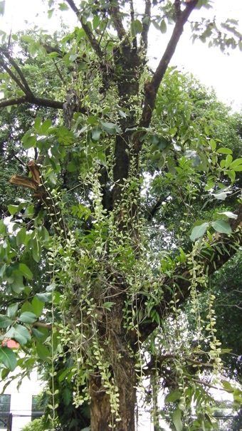 2010.08.17 チェンライ市内。 これも市内の大きな街路樹に着生していたものである。昔東京ドームのラン展の展示ブースのいくつかでこの蔦をデコレーションしたものを見た記憶に従っているのだが、ラン展=ランと単純な連想なので、これがラン科植物であるのかマメヅタと同じシダ植物なのかもわからない。
