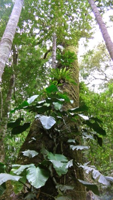 上の写真の左2枚は8/16に村の養蜂の巣箱をかける木、ミツバチの木を見に行ったとき、その木のすぐ近くの大木にモンステラが着生しているのを見つけ撮影したもの。右はチェンライ市内の役所の敷地から道路にはみ出した大木にからみついたセロームを撮影したもの。