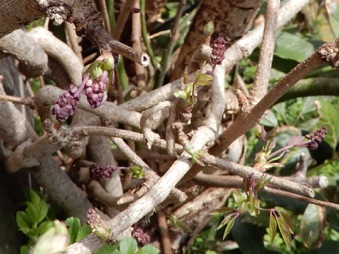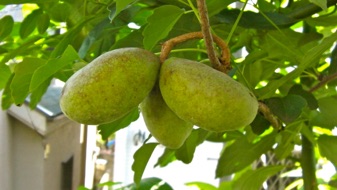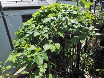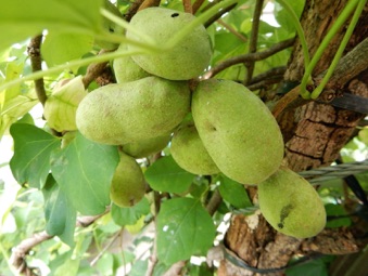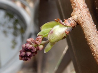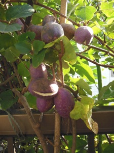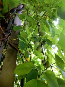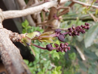 2012.05.18 自宅 小さな実が着いた。4月20日頃にガイコツ山で開花しているアケビを見つけ、元気そうな雄しべを5、6個持ち帰り、自宅のアケビの雌しべに押し付けるようにして受粉のまねごとをしたのだが、その効果が現れたのか。奥方の推測では、寄り添ってるアボガドの木が枯れて、いつもは日照を遮るアボガドの葉がなくなった所為とのことだが、いづれにしてもうれしいことだ。