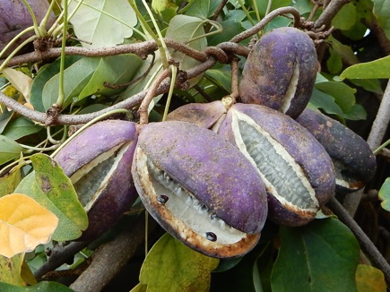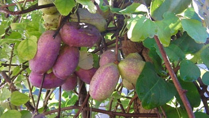 2010.11.22記: 自宅のアケビが遂に実を付け色づいた。3個だけだと思っていたら葉に隠れて小さいのがもう一つ付いていた。今年は観察のみ、玄関の飾り物になっている。来年以降は料理かな。