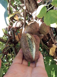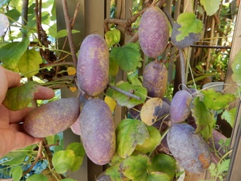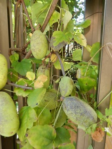 2012.11.12 口を開けたものを早速収穫し中身を味わう。果汁は淡白な素っ気ない甘さ。ほとんど種。ペっと庭にまき散らす。