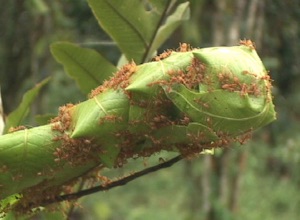 小型の透き通った茶色のアリで、木やシダの葉を使い空中に巣作りをする。帽子も被らずに頭上のこのアリの巣にぶつかったりすると大変危険だそうだ。