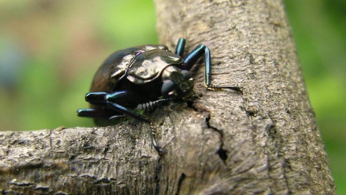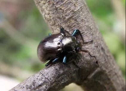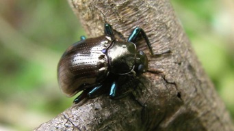 ビエンチャン近郊のDongBangの林のハムシA。10mmほどの大きさしかないが青光りする脚が外に大きくはみ出しているので大きく見える。脚が横にはみ出した体型からサルハムシの仲間に違いはなさそうであるが、日本の種で似たものを探すのは難しい。