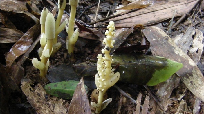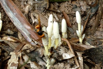 自然保護区の森に入って10分も歩かないところに大きな木が横たわっていて、その根方に当るところ、一番暗くなっているところにこのキノコ様の腐生植物があった。若いうちはツクシの頭のように滑らかな砲弾型であるが、徐々に砲弾型が延びてきて表面にも亀裂が入りながら成長して行く過程が撮影できた。