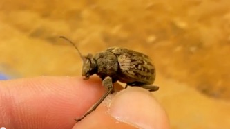 姿、形からサルハムシの仲間であろうことはすぐにわかったが、前ページのコガネムシ_2と同じかそれ以上に大きかったので、にわかにはこんなサルハムシが存在することが信じられなかった。撮影していて残念に思ったのは、写真に明瞭に見て取れるように胴の右側が押しつぶされたようになっており、いやな言葉だが完品とはいえない状態であった。それでも細かい金色の毛に包まれた紫色の体色は高貴なビロードの衣装のようであり、堂々としていて魅力的である。