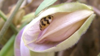 村に向かう日の朝、ホテルの脇にある空き地で撮影した。大きさは日本のヒメカメノコテントウ程。はじめ、マメ科の花の中に潜んでいるのを見つけ、それからは草むらのあちこちで見つけた。胸、頭の模様は同じだが、翅の模様が異なるものを数タイプ見つけ撮影した。模様からすると、沖縄で撮影したダンダラテントウに似ている。リンクは張っていないが、やはり沖縄で撮影したハイイロテントウは大きさも模様も良く似ている。ハイイロテントウはアメリカから米軍の貨物と一緒に運び込まれたという解説を読んだことがあり、当方の資料を見返すとサンフランシスコの記録に残っていたのでリンクを張ることにした。