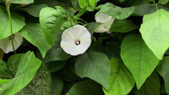2012年4月2日 タイを出国する日の朝、ホテルの脇道で撮影した。葉の形は典型的なハート型。このページではNo.1に紹介するが撮影したのは最後の最後。これが一番アサガオらしいと思う。これには種があったので花と種を同時に撮影できた。